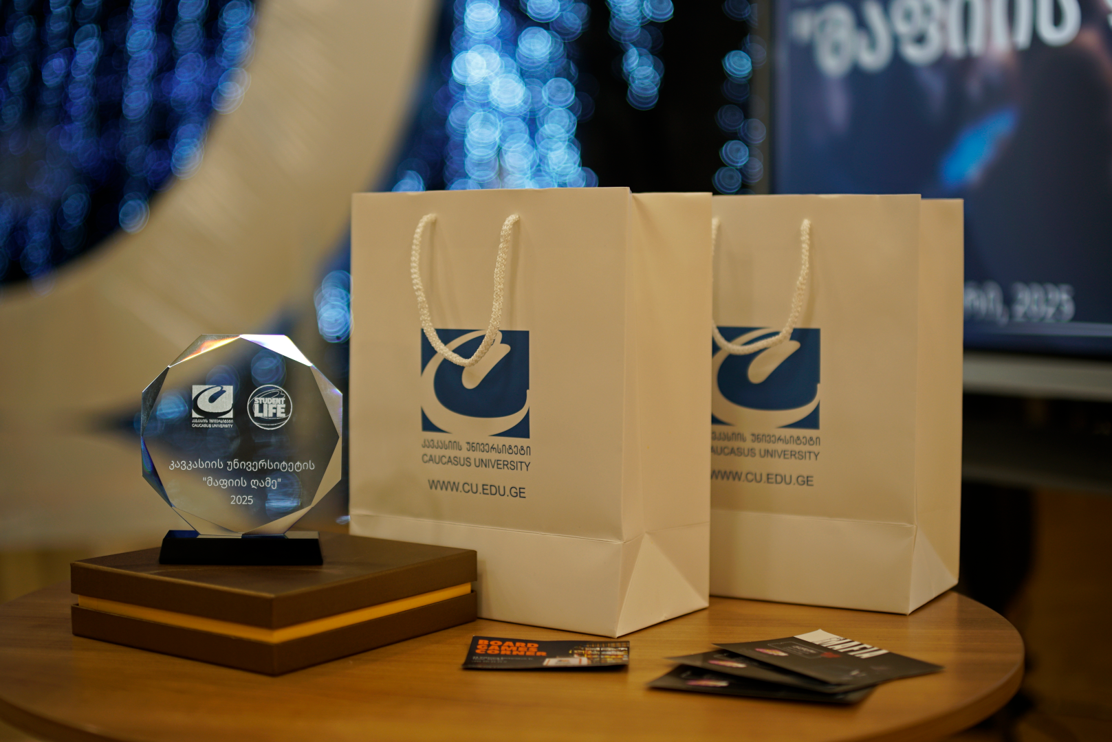 თითოეულ გამარჯვებულ მოთამაშეს კავკასიის უნივერსიტეტისგან გადაეცა ბრენდირებული საჩუქრები, „უბანზე გეიმინგ“-სგან კი 12 კაციანი „მაფიის“ ვაუჩერი, პირველ ადგილოსანს კავკასიის უნივერსიტეტისგან გადაეცა „მაფიის ღამის“ ჯილდო, ხოლო “Board Games Corner”-სგან- 100 ლარიანი ვაუჩერი.