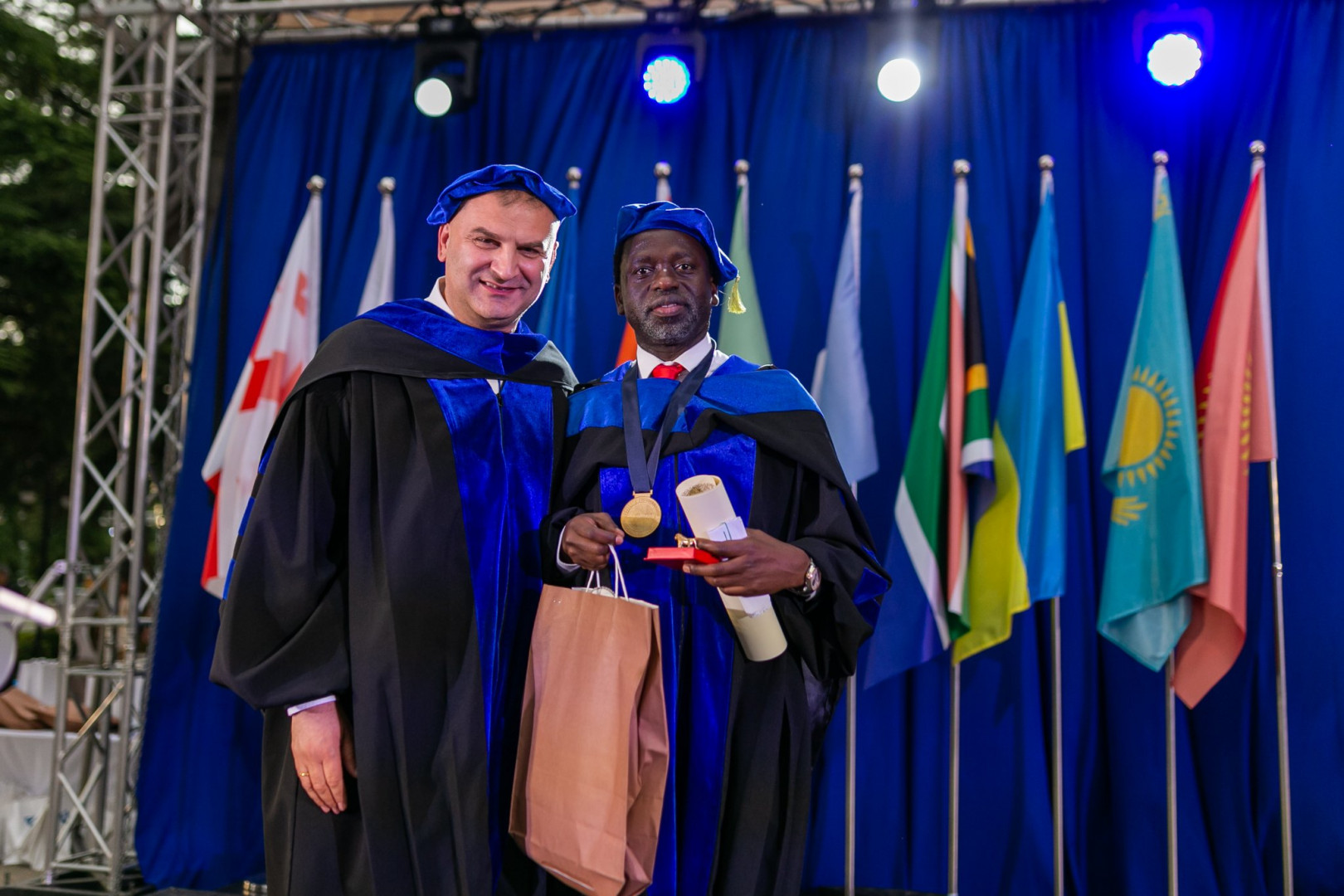 The title of Honorary Doctor was awarded to: President of CETYS University (Mexico) and President of the International Association of University Presidents (IAUP) Dr. Fernando León García, President of the University of Johannesburg and Rector of the United Nations University (Tokyo, Japan) Dr. Tshilidzi Marwala, the world-famous specialist in the field of mathematical modeling of the dynamics of complex systems and the first elected president of Kyrgyzstan (1990-2005) Askar Akaev, a foreign member of the Georgian National Academy of Sciences, the famous French Kartvelologist Professor Bernard Outtier.