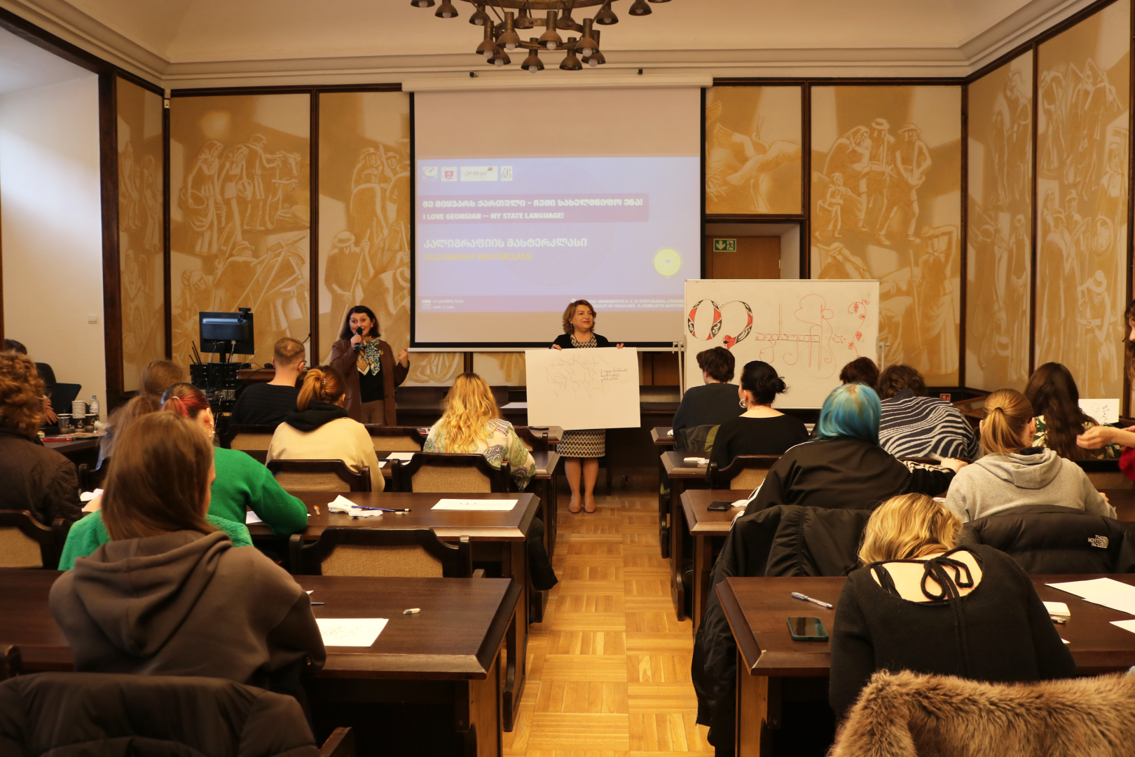 ქართული კალიგრაფიის ხელოვნების მასტერკლასზე დასასწრებად 60-მდე ლიეტუველი სტუდენტი და პროფესორი მოვიდა. ვილნიუსის უნივერსიტეტის პროფესორმა, ფილოლოგიის ფაკულტეტის უცხო ენათა ინსტიტუტის დირექტორმა რომა კრიაუჩიუნიენემ (Roma Kriaučiūnienė) აუდიტორიას გააცნო პროექტის ისტორია და კავკასიის უნივერსიტეტთან თანამშრომლობის ღირებული გამოცდილება; ვილნიუსის უნივერსიტეტის ფილოლოგიის ფაკულტეტის დეკანის მოადგილემ - გინტარე იუჟენტიტე-შინკუნიენემ (GintarėJudžentytė-Šinkūnienė) ისაუბრა სხვადასხვა კულტურის სიღრმისეულად შესწავლის მნიშვნელობაზე. მან აღნიშნა, რომ კალიგრაფია არის ერთ-ერთი გამორჩეული ხიდი ქართული კულტურის შესწავლის თვალსაზრისით.